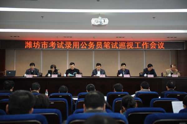 4月10日下午,潍坊市2013年考试录用公务员笔试巡视工作会议在阳光大厦四楼会议室召开,市人社局局长李静波出席会议并讲话,市委组织部副部长、市老干局局长邱尔臣,市纪委常委、市机关效能监察中心副主任董胜俊,副局长钮效正、刘丽宁、市公务员管理办公室主任刘立新等出席会议,会议由市委组织部副部长、市老干局局长邱尔臣主持。全系统235名参与笔试巡视的工作人员参加会议。