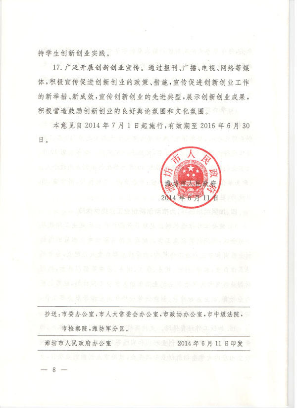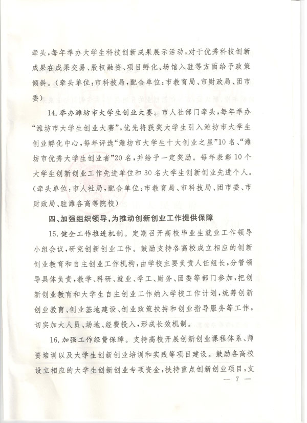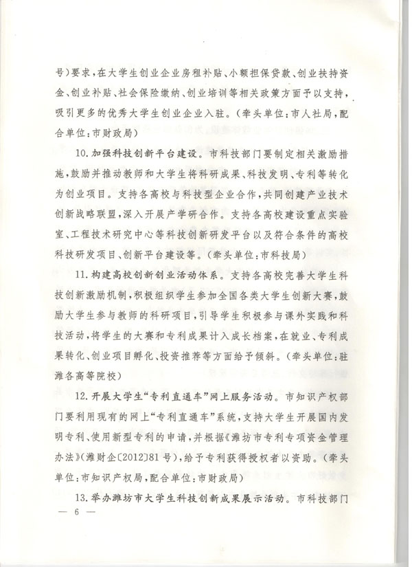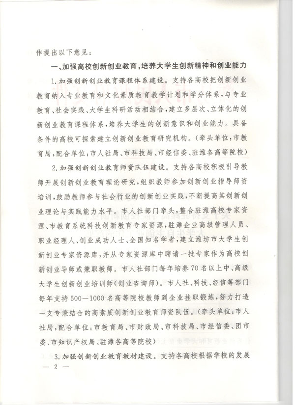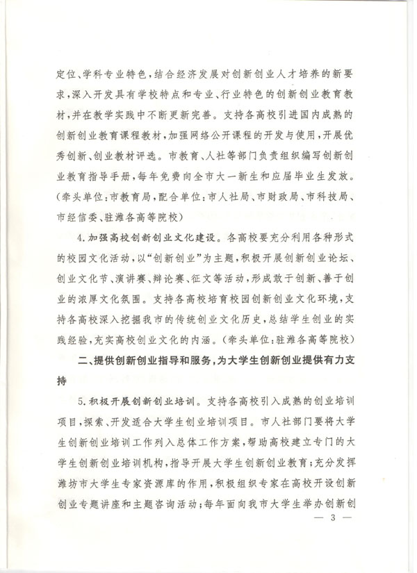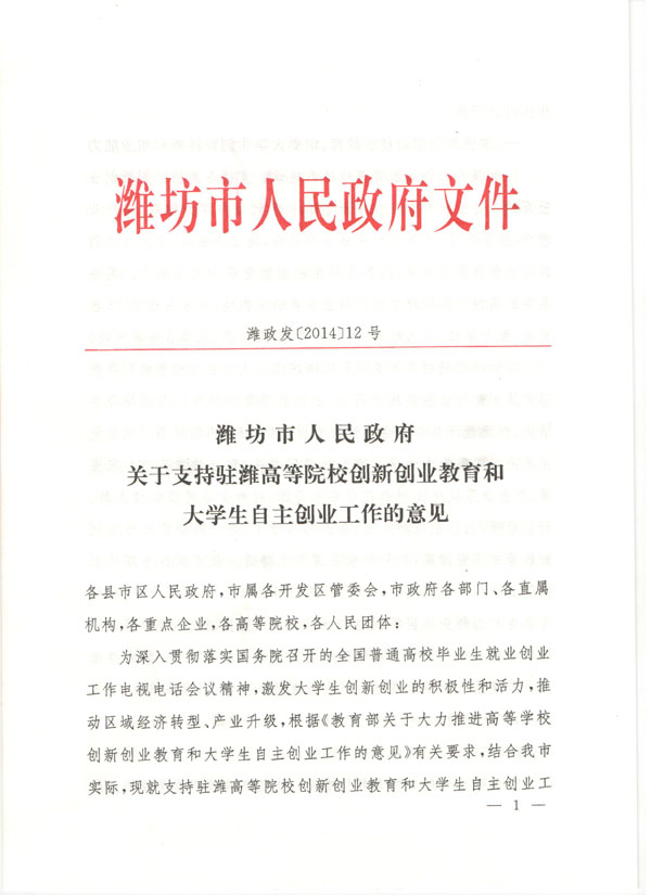 潍坊市人民政府关于支持驻潍高等院校创新创业教育和大学生自主创业工作的意见