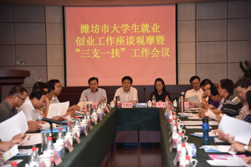上午,会前与会人员观摩了潍坊市大学生创业产业园,会上传达了《潍坊市人民政府关于表彰潍坊市大学生创新创业工作先进集体先进个人和大学生十大创业之星优秀大学生创业者的通报》,一起学习解读了《关于鼓励和支持台湾高校毕业生来潍坊创业就业的通知》、《关于促进大学生到农村创业的通知》、《关于做好大学生创业示范平台奖补资金管理使用工作的通知》、《关于加快推动大学生创业孵化和创业加速平台建设的通知》等一系列支持大学生就业创业的政策文件,部分县市区、高等院校就大学生就业创业工作和三支一扶工作典型代表做了发言。