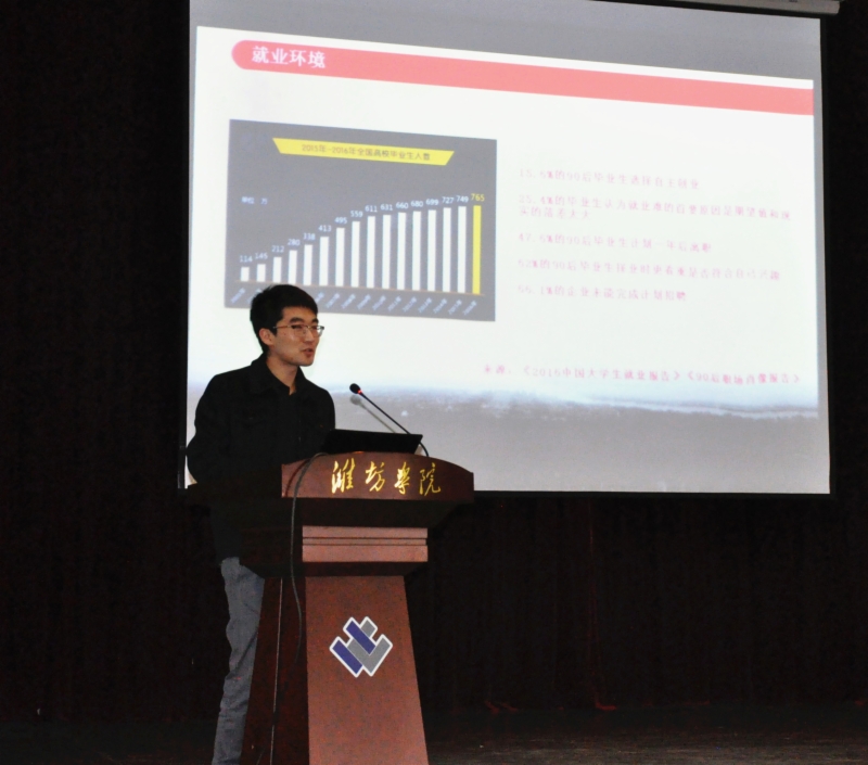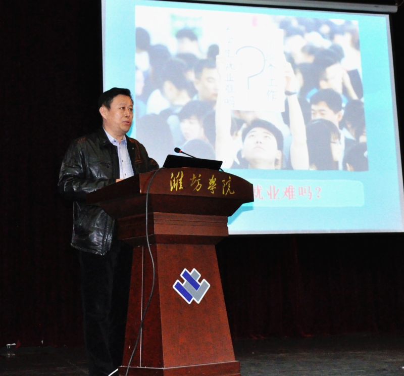 潍坊市大中专毕业生就业指导中心、潍坊市大学生创新创业管理服务中心主任王术平在宣讲会上分析了大学生就业形势、就业途径,并介绍了潍坊市为促进大学生就业创业所出台的一系列就业创业政策和具体举措。